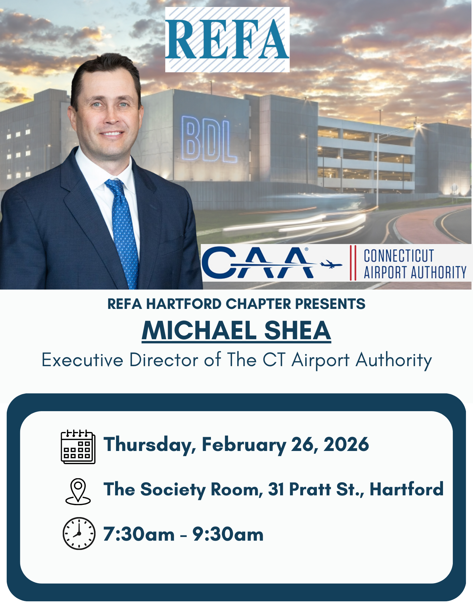 Join your REFA Hartford Chapter colleagues on February 26th for an insider’s update from CT Airport Authority Executive Director Michael Shea to see how improvements to Bradley Airport are paving the way for smoother travel and stronger regional connectivity. The recently completed East Concourse exit corridor marks the first milestone in a $250M+ investment that includes faster terminal exits, expanded TSA screening capacity, a new mile-long baggage system, and additional gates scheduled to open by the end of 2025.